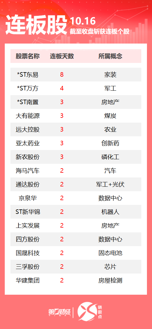 10月16日 ,Wind数据显示,A股市场共计55只个股涨停 。其中煤炭股大有能源收获3连板,数据中心概念股京泉华、四方股份2连板。一图速览今日连板股>>